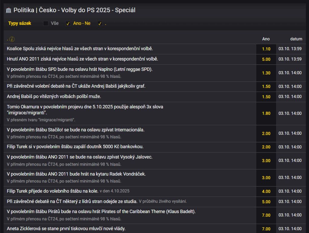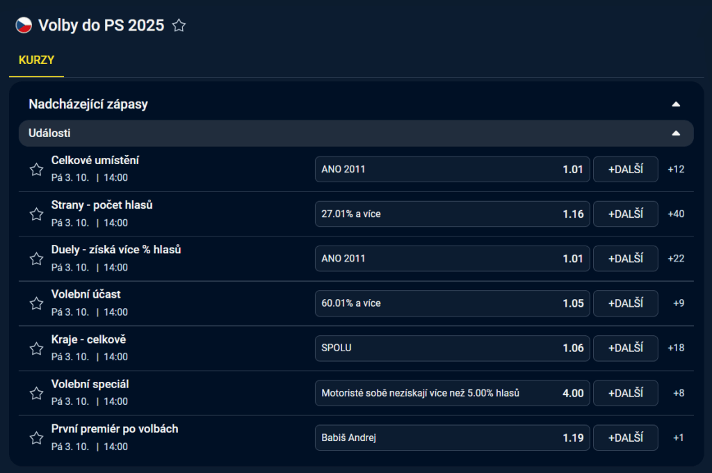 A nechybí samozřejmě ani možnost uzavírat sázky na volby 2025. Zde jsou na výběr například takové sázkové příležitosti jako sázka na to, že se Kateřina Konečná (KSČM) stane ministryní obrany (kurz 15) nebo že Tomio Okamura v povolebním projevu použije alespoň 3x slova „imigrace“/“migranti“.