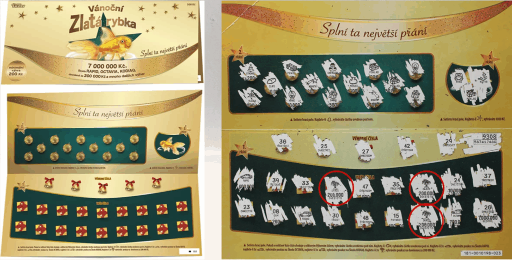 Super Zlatá rybka (100 Kč): Hlavní výhra je 4 miliony Kč, s možností získat 700 000 Kč na auto a 200 000 Kč na dovolenou. Dostupný online i jako papírový stírací los.